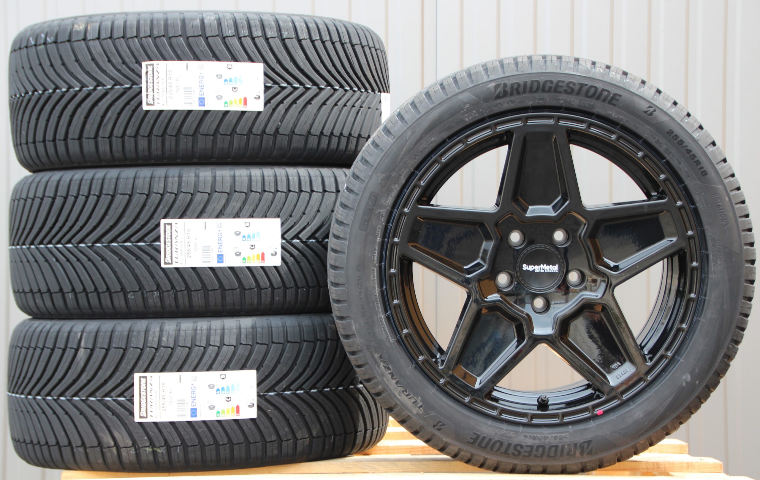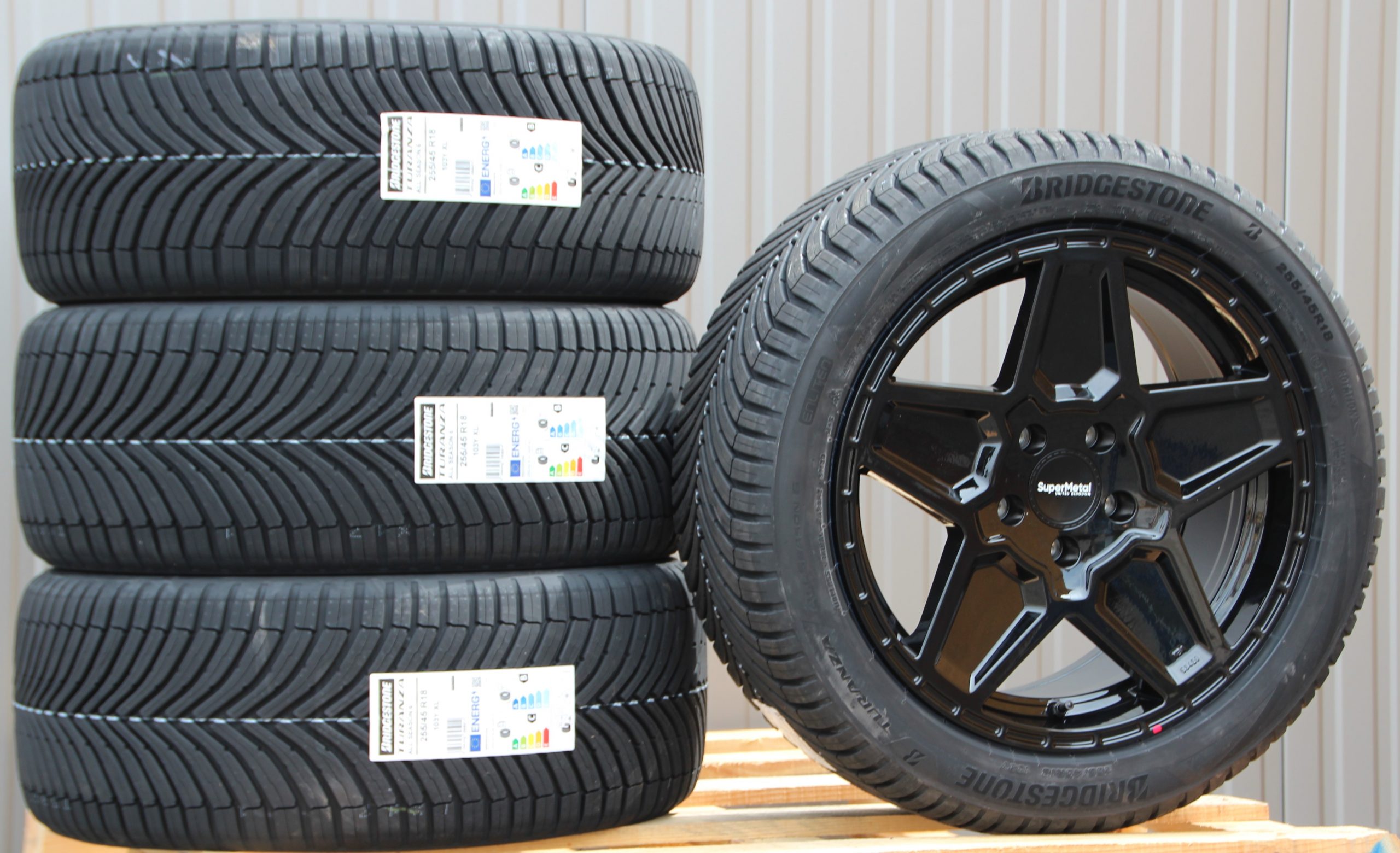 Satz Räder Alufelgen Supermetal Rocket 18 Zoll gloss black + Bridgestone Allwetterreifen 255/45 R18 103Y